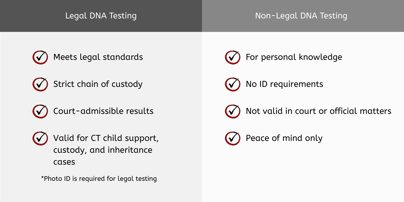 BioLink Mobile Lab provides legally recognized DNA testing services that meet Connecticut court and government requirements. All legal DNA tests follow strict chain-of-custody procedures, ensuring results are accurate, documented, and admissible for official use. Our role is to provide reliable testing - not legal advice - so you can move forward with confidence.